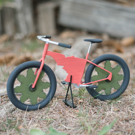 The Idaho Bike was created using Blender and then printed 3-dimensionally. The design features spokes in the shape of pine trees and stands 5" tall and 12" long.